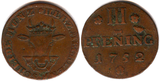 #85 | 1752, 3 pfening, KM 171, VF-XF