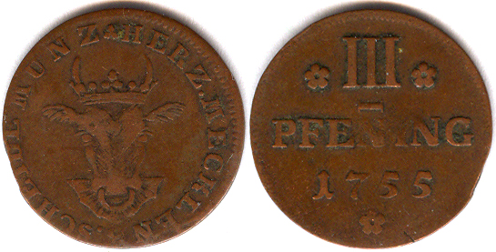 #86 | 1755, 3 pfening, KM 171, VF-XF