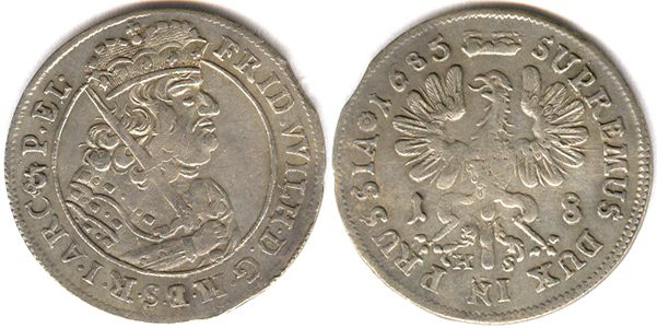 #90 | 1685, H.S. Konigsberg, 18 groscher (tympf), KM 468, Weyl 3467, v. Sch 1711, VF-XF