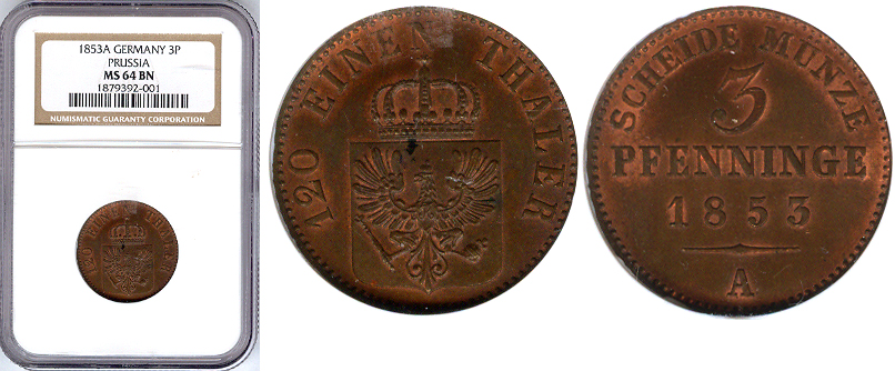 #91 | 1853, A, 3 pfenninge, KM 525, Y 109 , SLABBED, NGC MS 64 BN